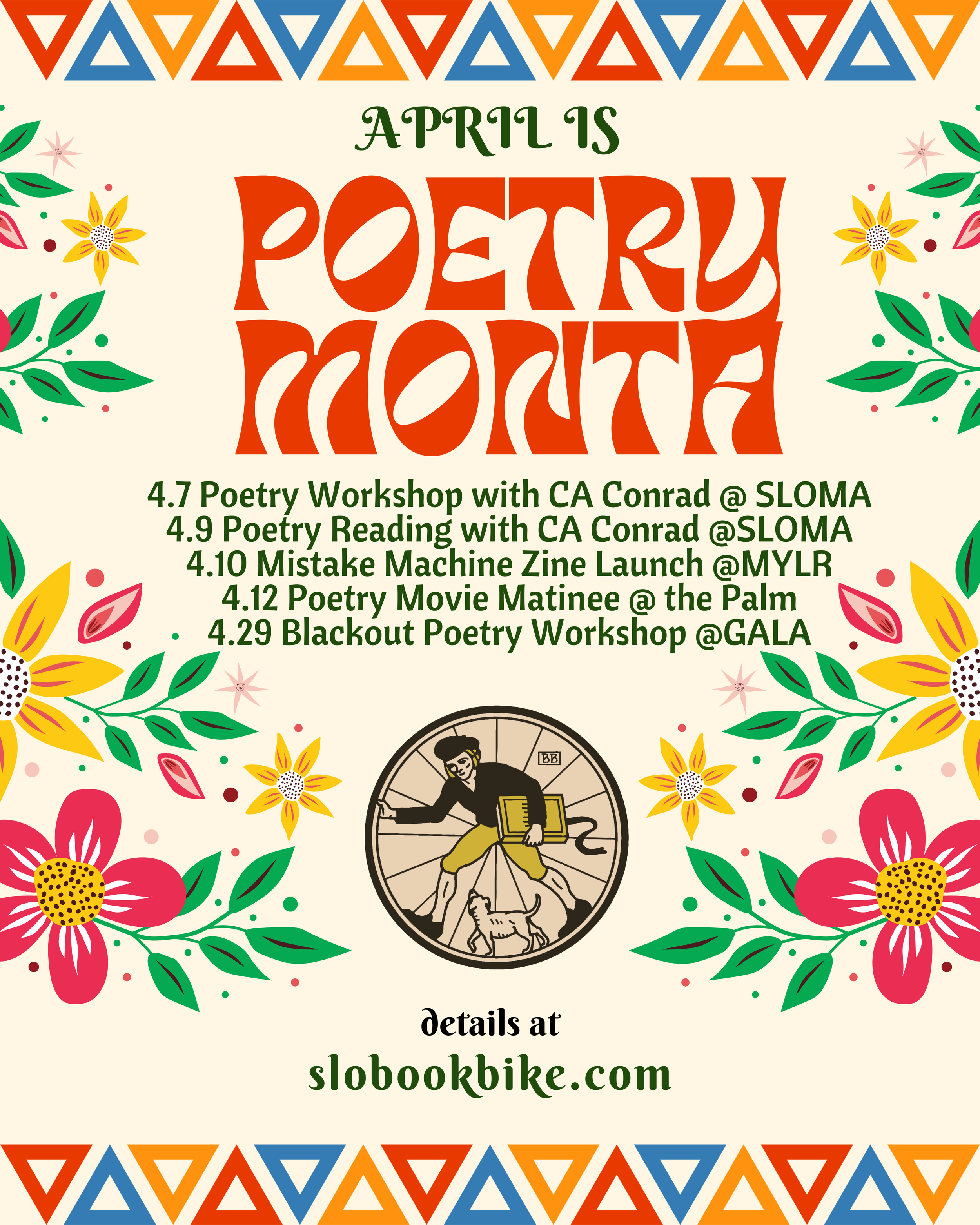 The SLO Book Bike is a queer-owned, bike-powered, pop-up book shop serving the city of San Luis Obispo. Our mission is to connect readers and writers in SLO through community events. We host readings, workshops, and pop-ups on a decidedly irregular basis.